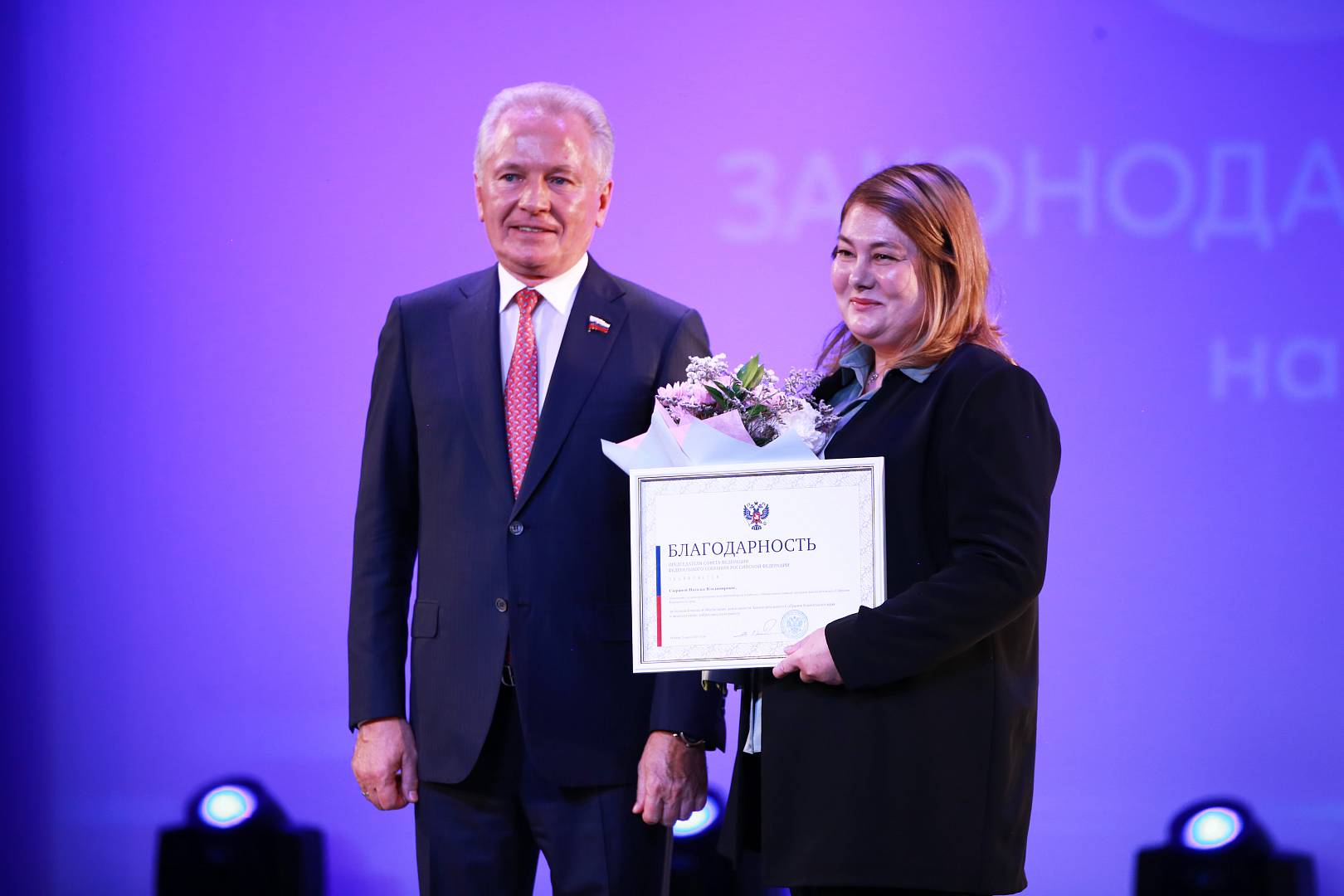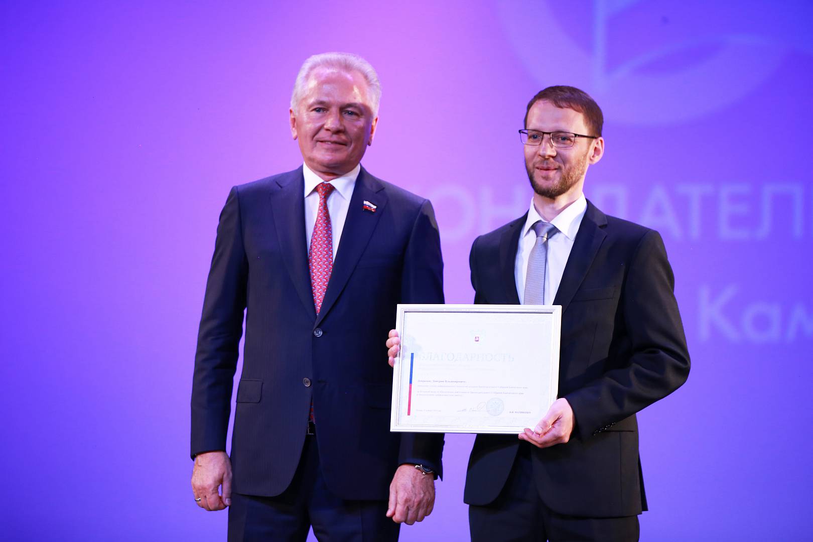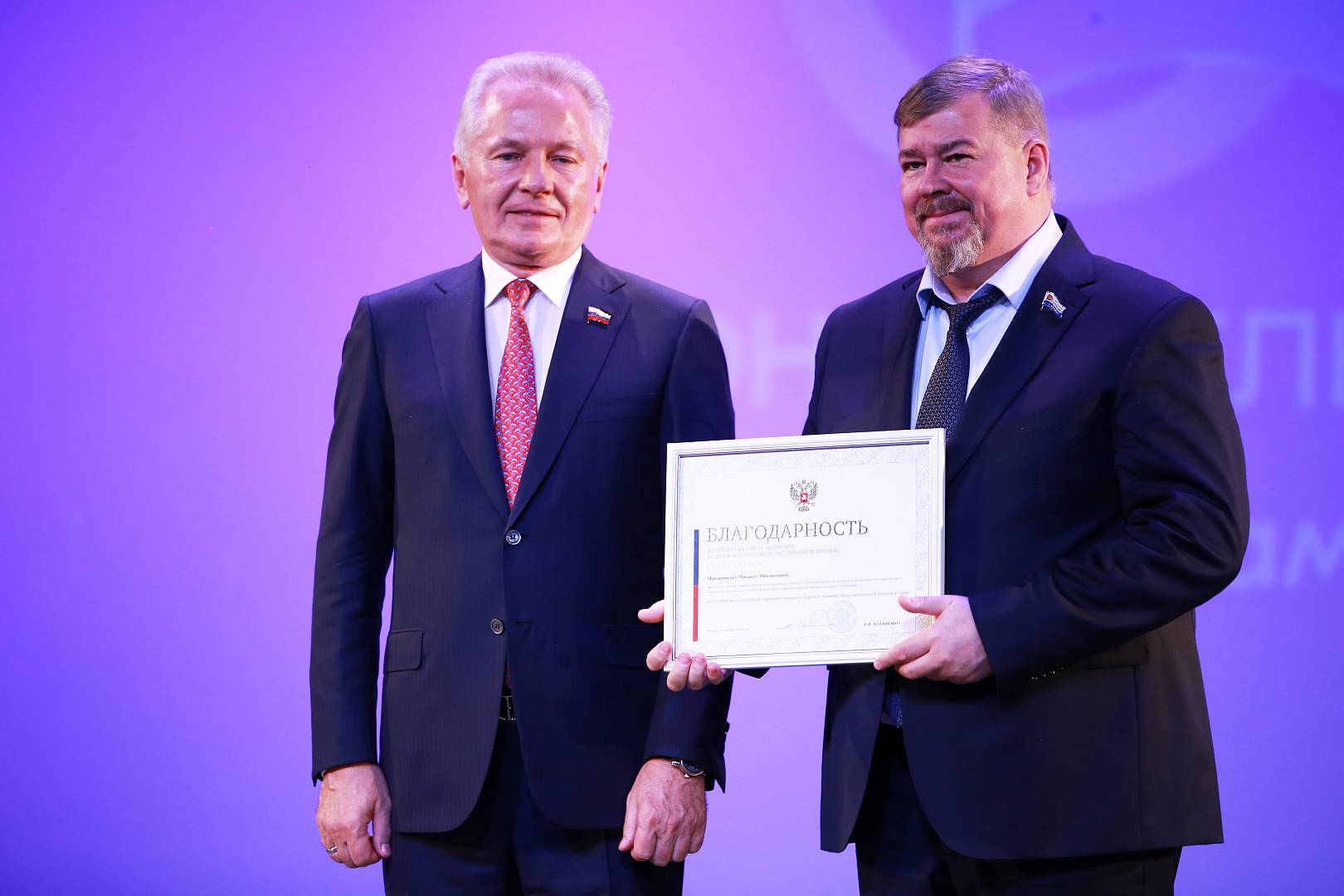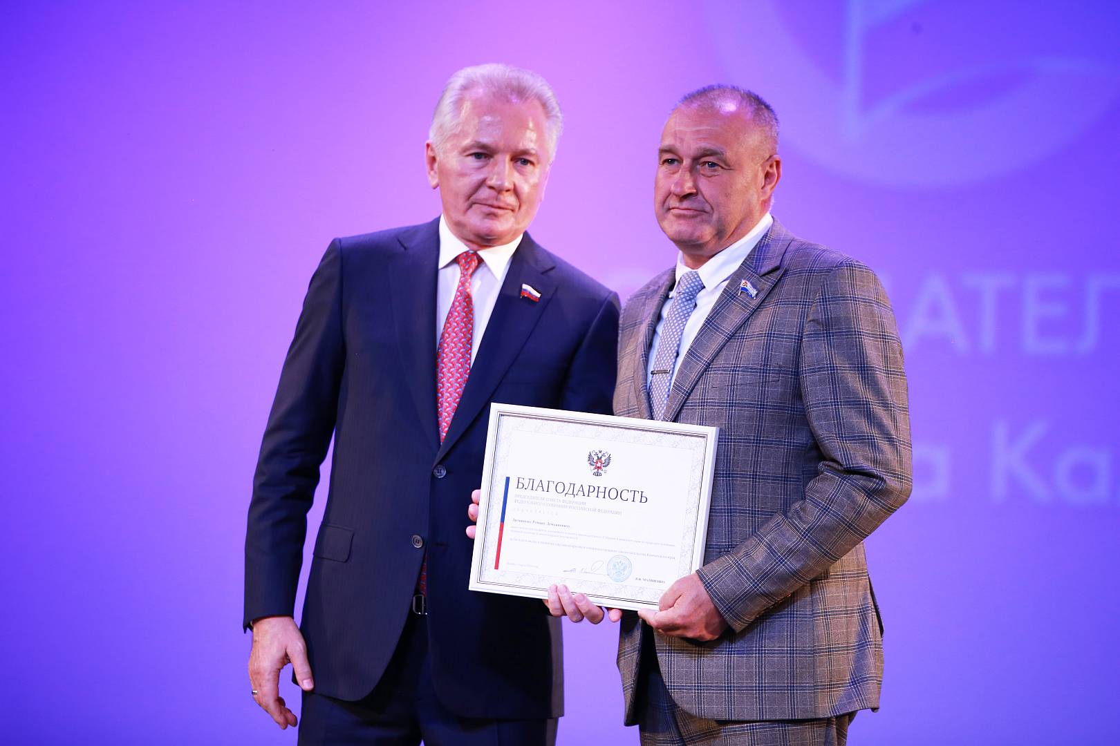 Благодарность Председателя Совета Федерации была объявлена Михаилу Мананникову, председателю комитета по вопросам государственного строительства, местного самоуправления и гармонизации межнациональных отношений, и Роману Литвинову, заместителю председателя комитета по природопользованию, аграрной политике и экологической безопасности, за их большой вклад в развитие парламентаризма и законодательства Камчатского края.