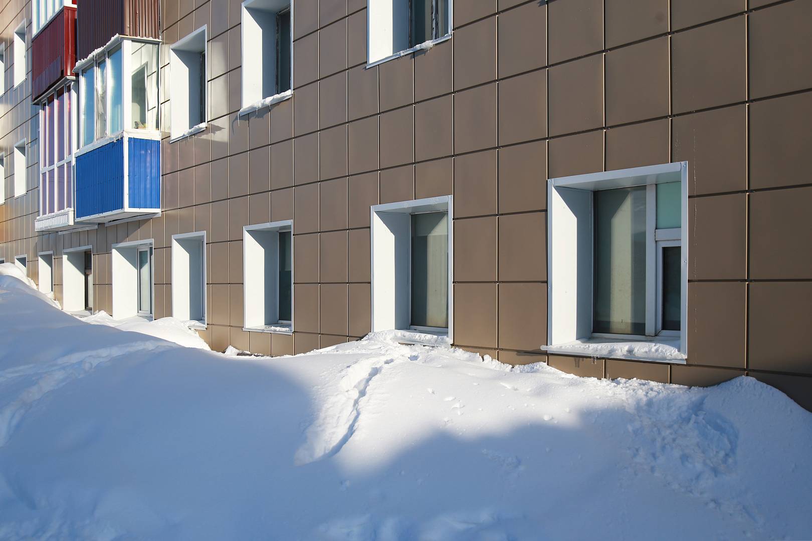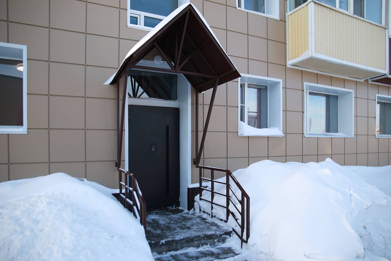 Второй этап включал в себя устройство навесного вентилируемого фасада из металлокассет с утеплителем и капитальный ремонт кровли. Теперь дом не только выглядит современно, но и стал значительно теплее. Кроме того, ремонт предусматривал установку новых крылец, чтобы жильцы могли заходить в подъезды, не поднимаясь на высокие ступени.