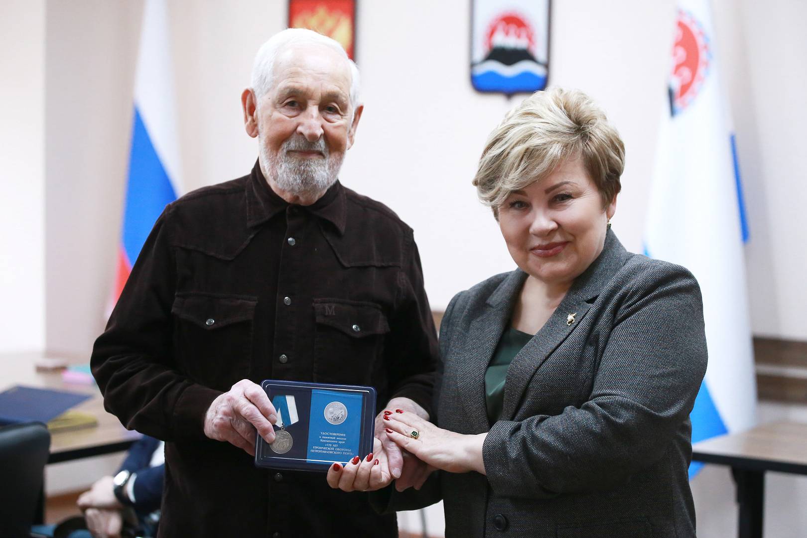Она вручила Виталию Шохину памятную медаль, выпущенную к 170-летию героической обороны Петропавловского порта от нападения англо-французской эскадры.