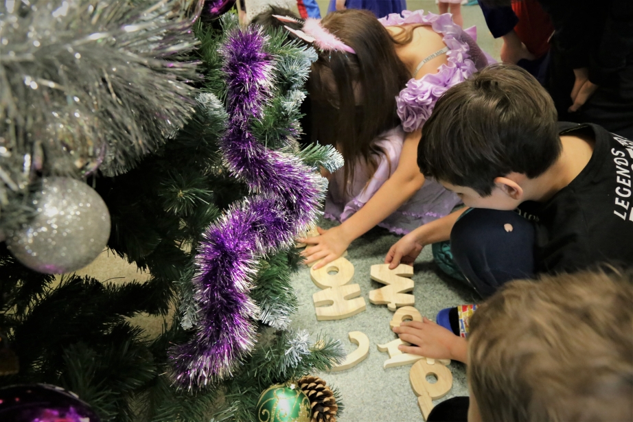 Малыши с теплом и радостью встретили волшебника, участвовали в его конкурсах, танцевали, пели, а также разгадывали квест, в котором нужно было в зале найти спрятанные деревянные буквы и оставить с ними словосочетание «С Новым годом!».